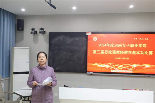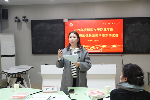 为深入学习贯彻党的二十届三中全会和全国教育大会精神,深入贯彻落实习近平总书记对学校思政课建设的重要指示精神,进一步加强高校思政课教师队伍建设,马克思主义学院于2024年12月21日在南校区顺利举办2024年度河南女子职业学院第三届思政课教师教学基本功比赛。本次比赛评审由郑州航空工业管理学院马克思主义学院教授,河南省高校思政课教指委委员江丽、我校副教授孙桂丽、付晓莉担任,马克思主义学院办公室主任李慧源主持此次比赛。全体专任思政课教师精心准备、认真参赛。