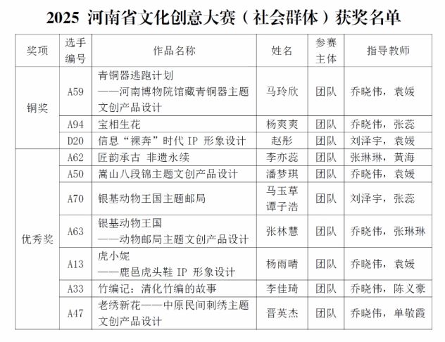 这一成绩充分彰显了学院“以赛促学、以赛促教、以赛促改”教学理念的扎实成效。学院将以此次大赛为契机,持续完善“赛教融合”机制,加强文化创意相关学科建设,紧密围绕河南文化发展需求,深化教学改革,为助推我省文化创意产业高质量发展贡献新的力量。