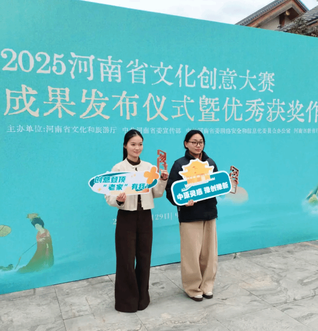 近日,2025河南省文化创意大赛成果发布仪式暨优秀获奖作品展在洛阳收官。河南女子职业学院美术与设计学院两名学生代表马玲欣、杨爽爽受邀出席活动,参加颁奖仪式,学院共有10组作品受邀参加本次展览。