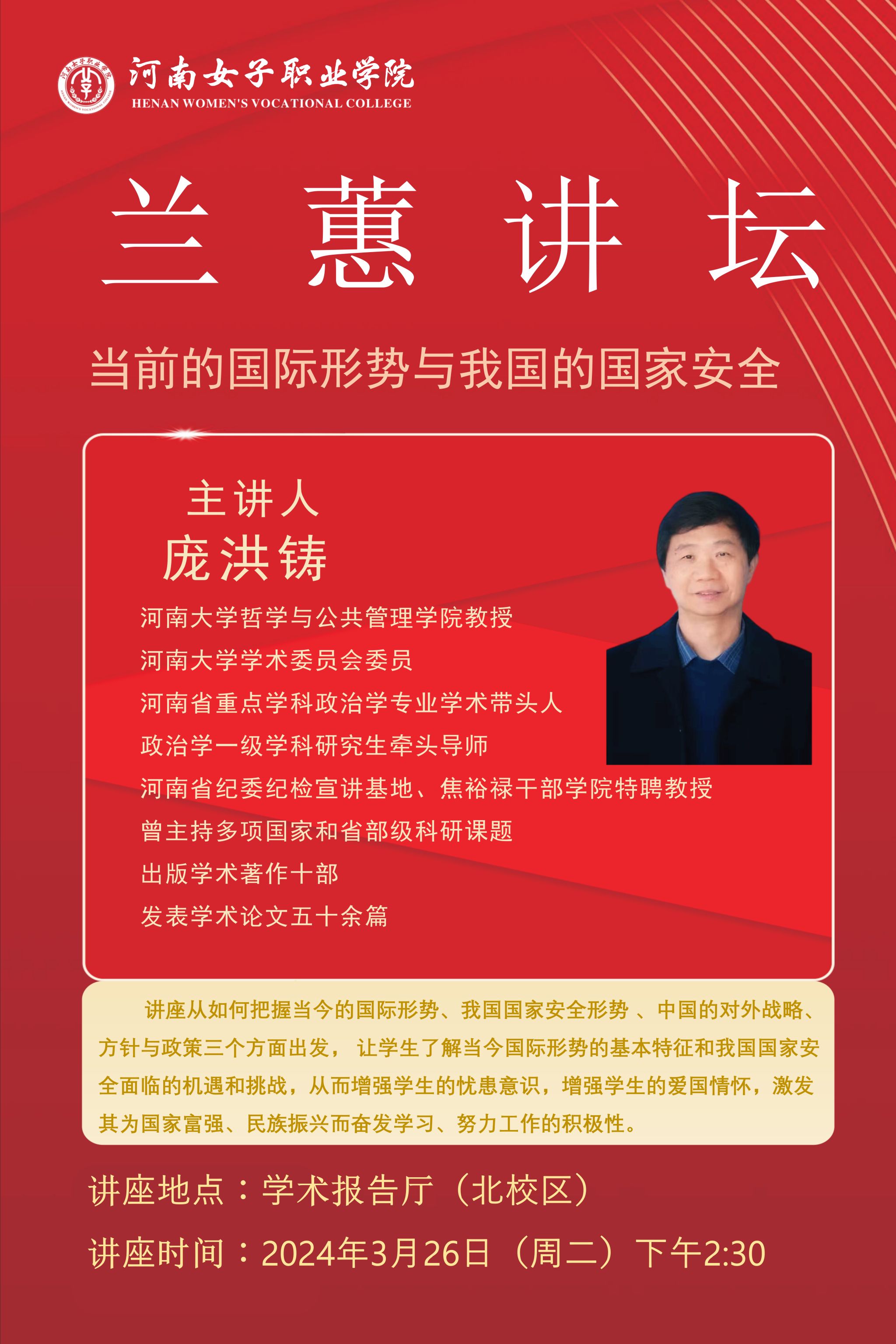 河南女子职业学院“兰慧讲坛”将于3月26日在北校区报告厅开展“当前的国际形势与我国的国家安全”主题讲座,主讲人为河南大学哲学与公共管理学院教授庞洪铸。
