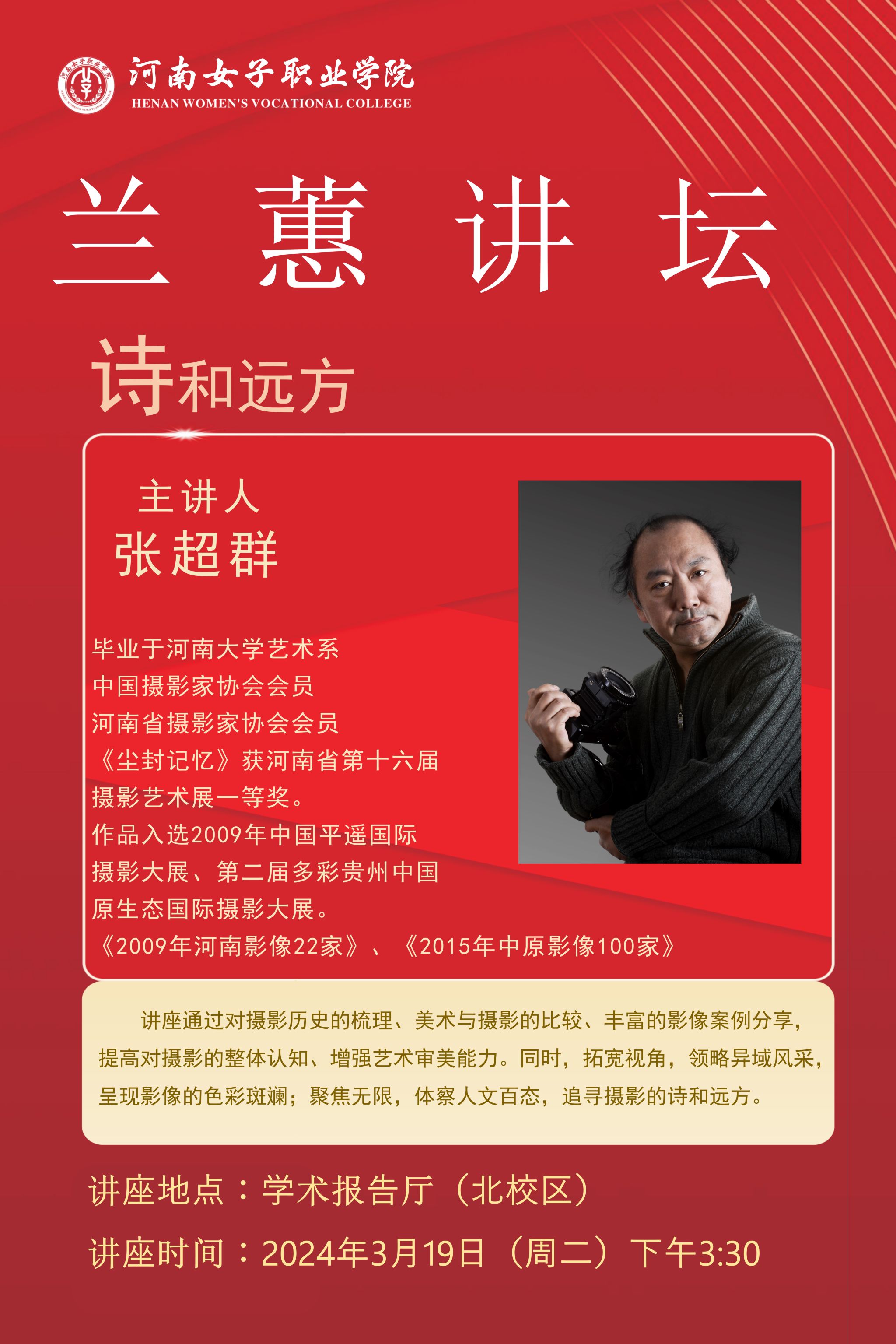 河南女子职业学院“兰慧讲坛”将于3月19日在北校区报告厅开展“摄影 诗和远方”主题讲座,主讲人为中国摄影家协会会员张超群。