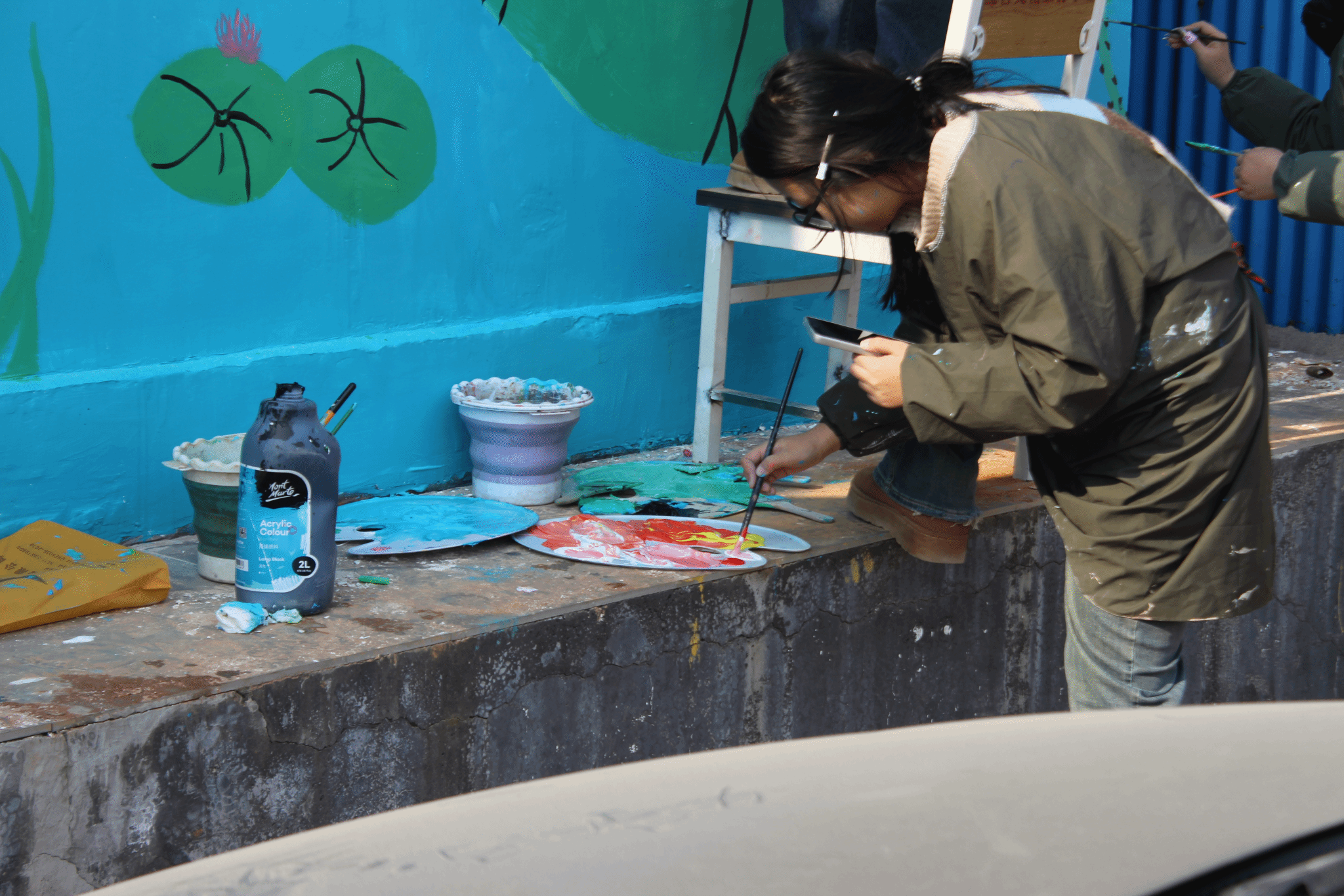 活动现场,志愿者们以墙面为画布,以色彩为语言,精心勾勒出一幅以池塘荷花为背景的美丽画卷。在专业教师的悉心指导下,同学们纷纷拿起画笔,于洁白墙壁之上精心构思、细腻打稿、流畅勾线、缤纷上色。转瞬之间,原本单调乏味的墙面焕发出勃勃生机,一幅以池塘荷花为主题的绝美画卷徐徐展开,每一朵荷花都倾注了同学们对艺术的赤诚热爱与执着追求,更凝聚着他们对劳动精神的深刻体悟与躬身践行。