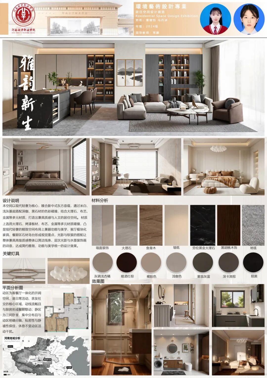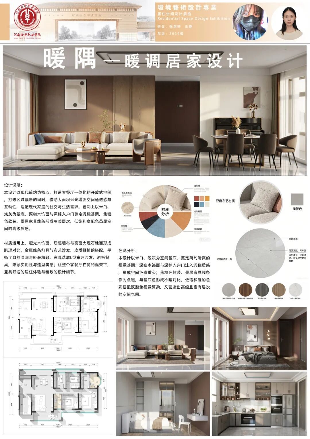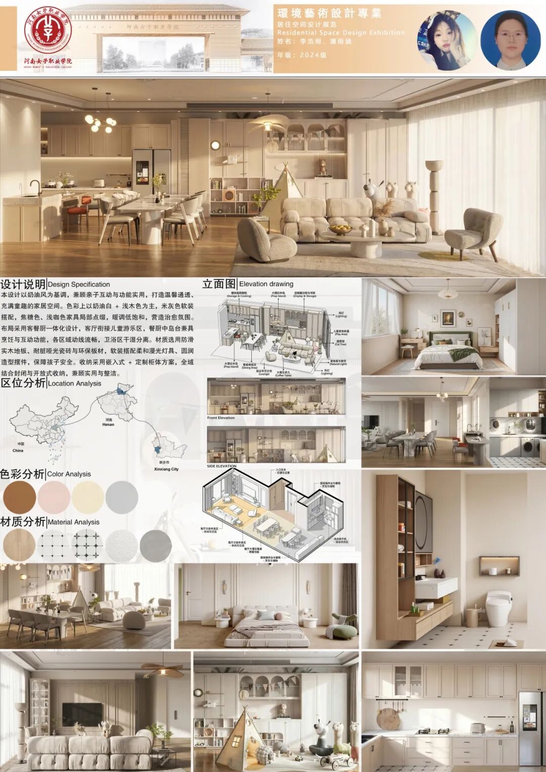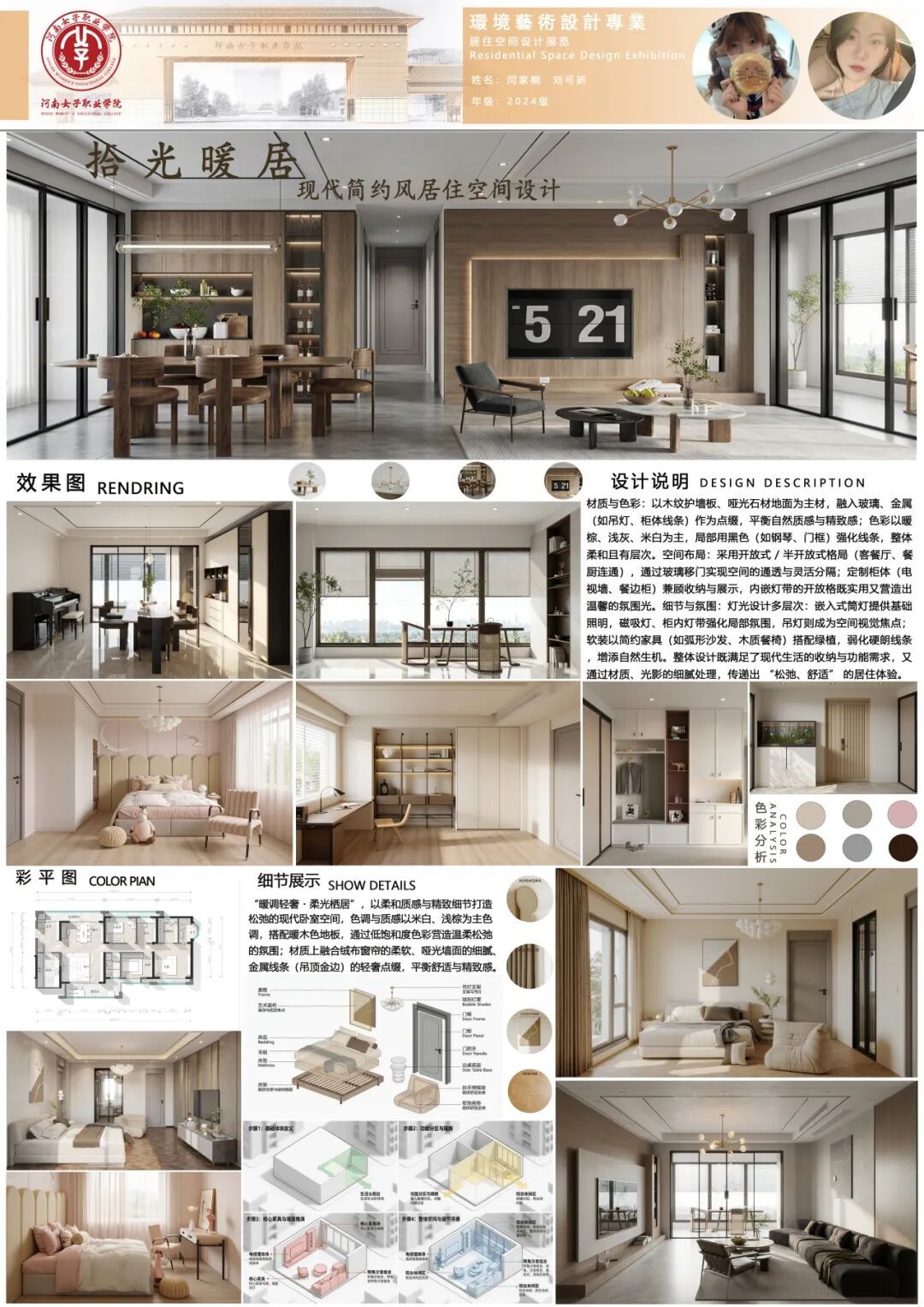 “居住空间设计”教学聚焦“功能与流线、材质与色彩、尺度与形态”三大维度,引导学生超越表层风格,深入探究居住空间的本质逻辑与人文关怀。展出的作品完整呈现了从调研分析、概念构思到方案深化的全过程。学生们在有限的空间尺度内,巧妙平衡功能优化与视觉美感,展现了对动线组织、光影运用及材料情感的成熟把控。